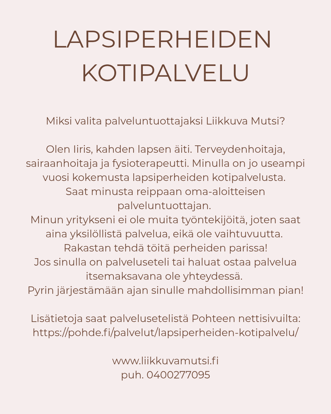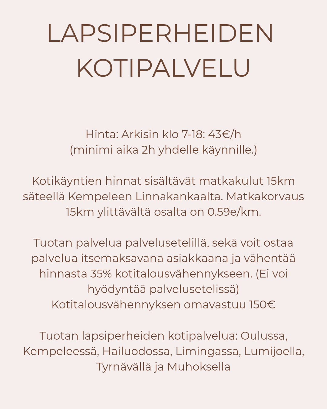 Teen muiden töiden lisäksi lapsiperheiden kotipalvelua Pohteelle Oulun alueella. Tuotan palvelua palvelusetelillä, sekä voit ostaa palvelua itse maksavana asiakkaana. Voit vähentää itsemaksavana asiakkaana lapsiperheiden palvelun hinnasta 35% kotitalousvähennykseen, ei voi hyödyntää palvelusetelissä. Kotitalousvähennyksen omavastuu on 150e.